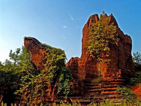 紅石林位于茄通和斷龍山鄉(xiāng)境內(nèi),方圓上萬公頃,精華景觀達(dá)數(shù)百公頃。那遍布的紅彩奇石造型各異,姿態(tài)萬千,或依山而立,或拔地而起,古樸秀雅,氣勢宏偉,身臨其境,恍如仙境。一尊高 12.6米的擎天石柱,猶如一東方巨人,指點(diǎn)江山;巨石對面,另一石則婀娜多姿,秀麗動(dòng)人。另有一山頭遍布紅石,或高或低,或長或短,游人入此,頓覺撲朔迷離,難覓來路。入另一處石林,但見如墻似垣,高度不大,但排列組合得與樓蘭古城布局相差無幾。這里所有的石頭都披著一層細(xì)密的皺褶,如珊瑚礁一般,讓人想起幾萬年前這里是一片浩闊的大海,海浪時(shí)時(shí)轟鳴著一波波沖擊著礁石。